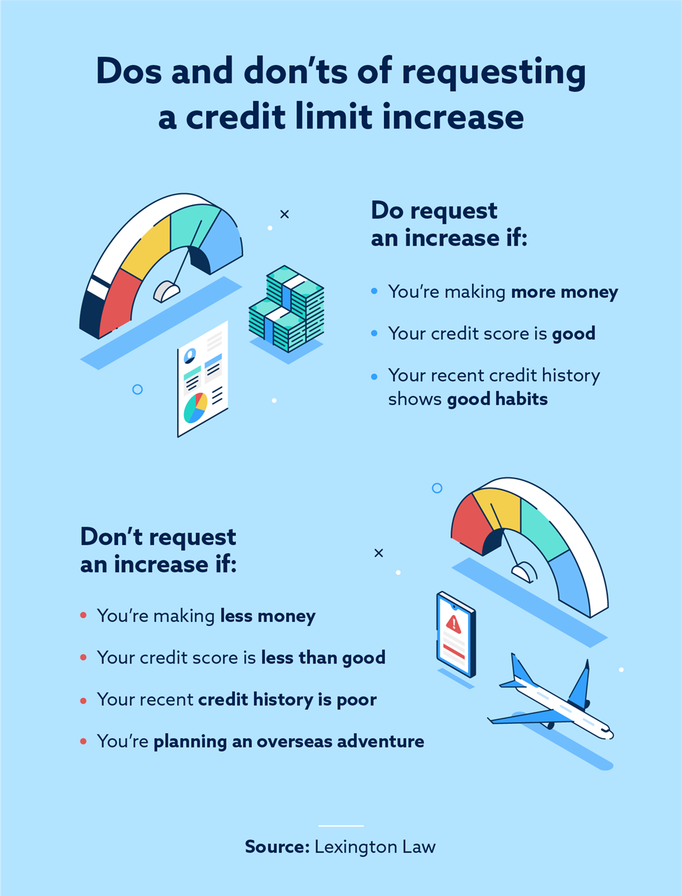 Unfortunately, a denied request can hurt more than just your ego. Because credit limit increases can trigger a hard credit inquiry, you may see a temporary dip in your credit score, especially if you don’t have an established credit history. Some times to avoid requesting a credit limit increase are when: