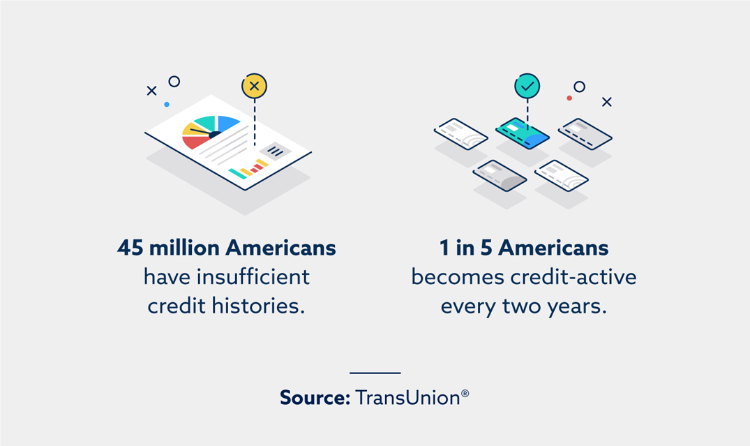 If you have an insufficient credit history, you are far from alone. TransUnion® reports that 45 million adults are essentially credit invisible, meaning they don’t have enough credit history to generate an accurate credit score. Only 20 percent of these adults become credit-active every two years.