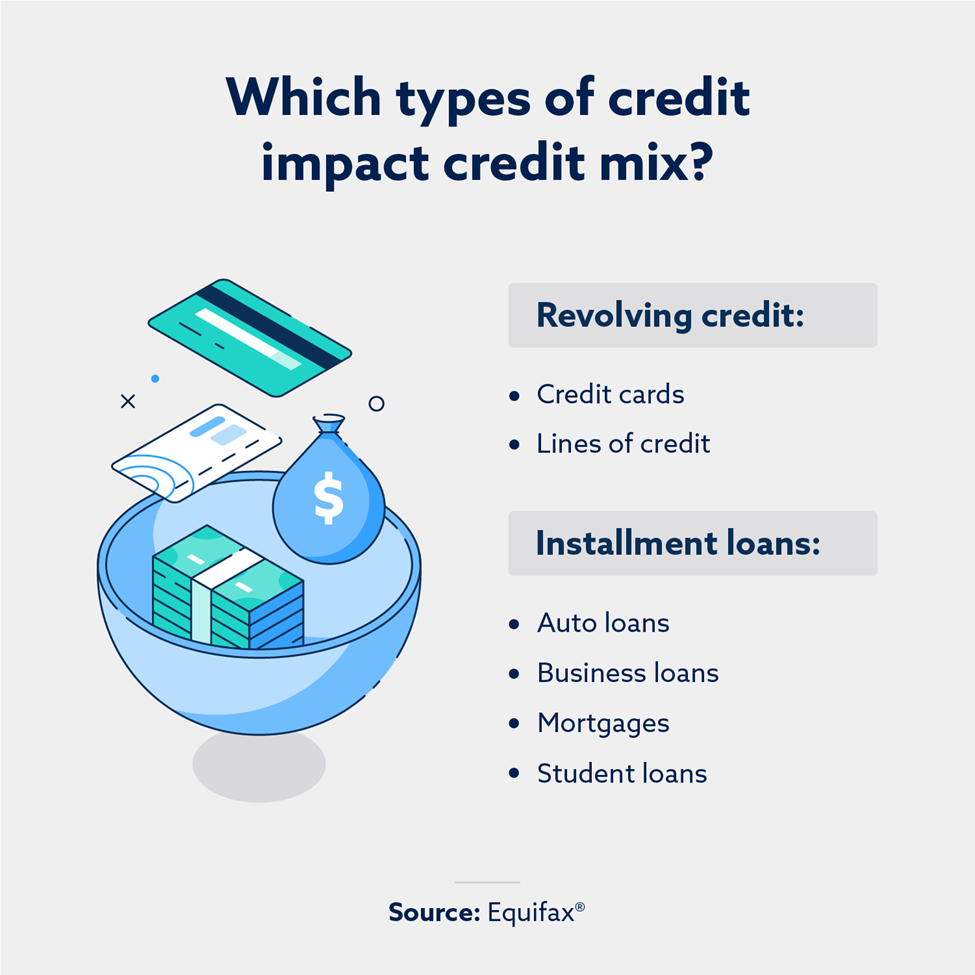 Auto loans, credit cards and student loans all contribute to credit mix.