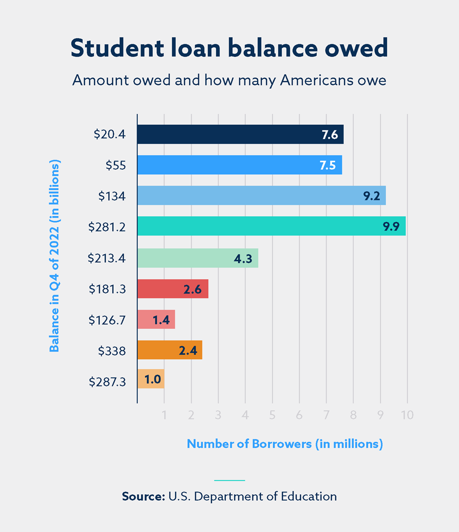 The total outstanding student loan debt is over $1.7 trillion with an average of $37,787 owed per borrower. Approximately 43.5 million Americans have some form of student loan debt.