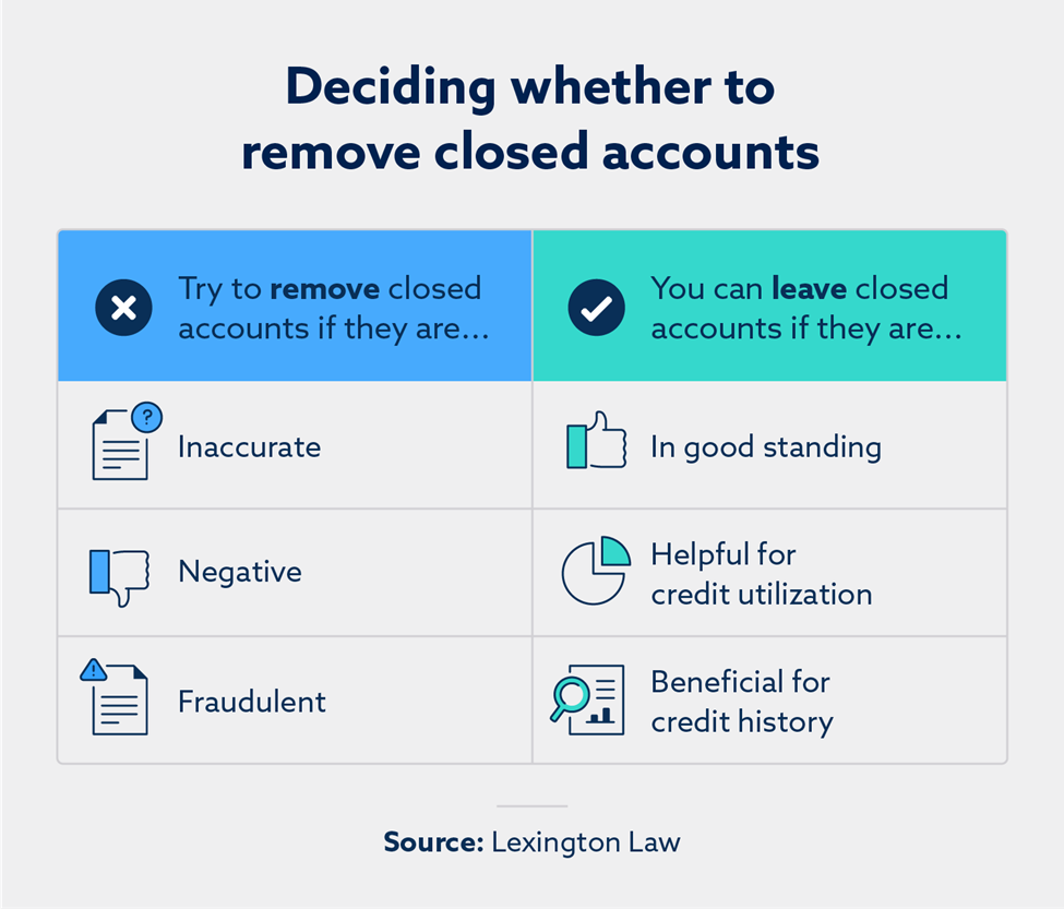 Below, we’ll talk about whether you should try to remove closed accounts from your credit report, how closed accounts may affect your credit score and how to remove closed accounts.