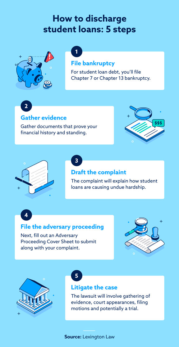 Filing either Chapter 7 or Chapter 13 bankruptcy could allow you to discharge your student loan debt. To do this, in addition to the normal bankruptcy process, you must prove that paying the loan amount is causing you undue hardship.