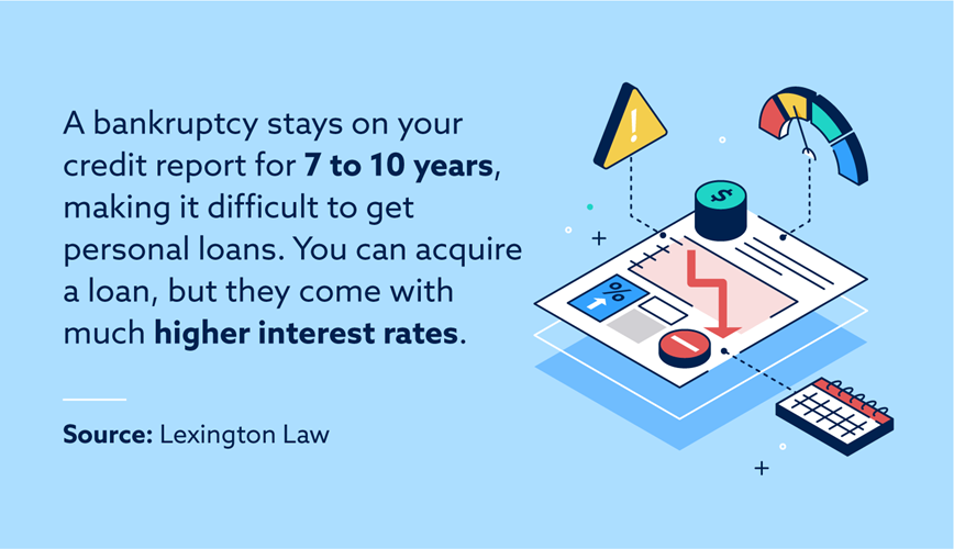 Bankruptcies and other derogatory marks, like collection accounts or missed payments, can significantly hurt your credit. When a lender checks your credit and sees a bankruptcy, they’re more likely to deny your personal loan application.