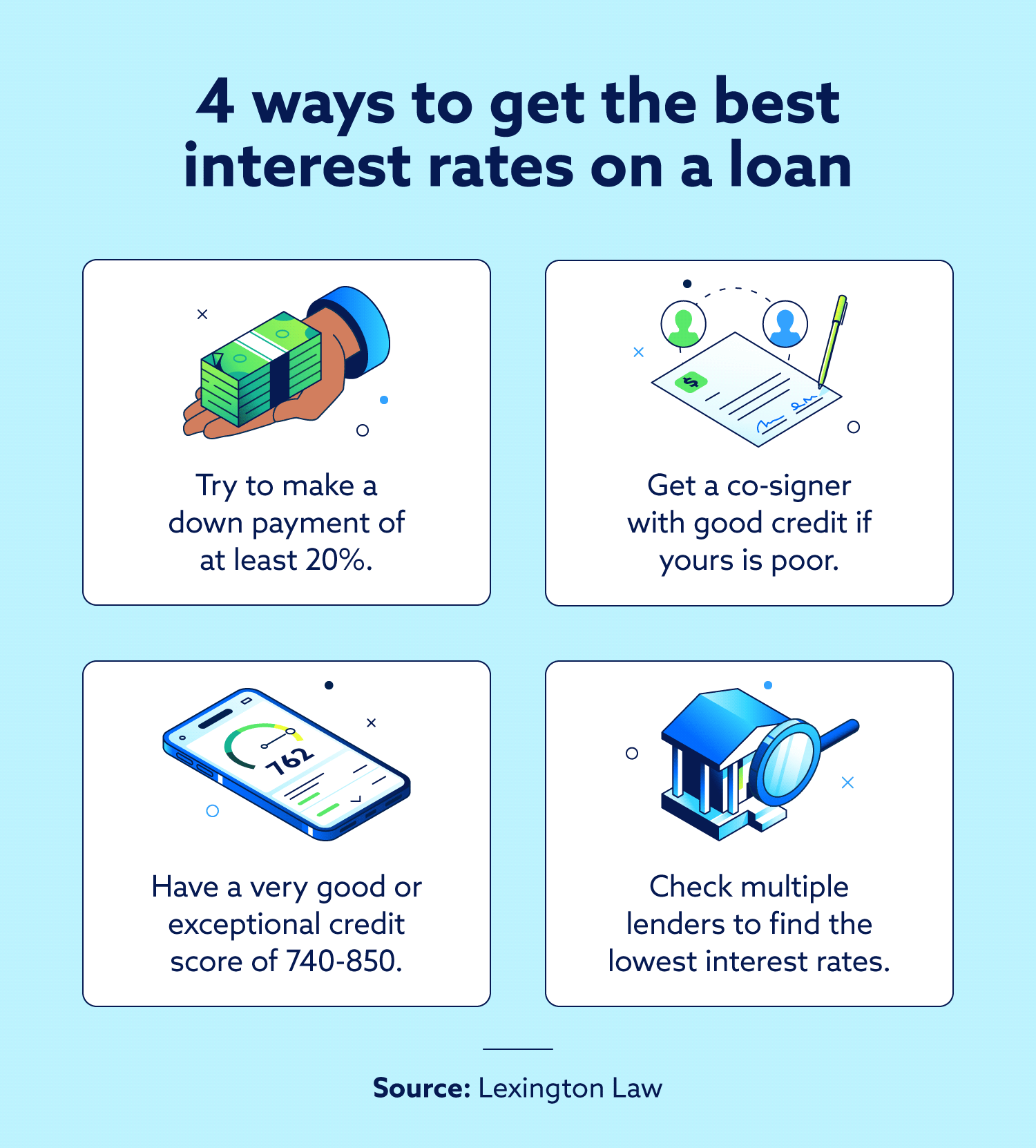 Before applying for a loan, the best thing you can do is improve your credit score. Whether you want a credit card, a car loan, or a mortgage loan, your credit score will play a major factor in the types of rates you get.